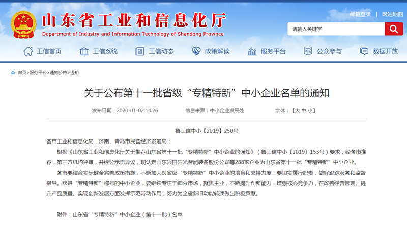 根據(jù)《山東省工業(yè)和信息化廳關(guān)于推薦山東省第十一批“專精特新”中小企業(yè)的通知》(魯工信中小〔2019〕153號)要求,經(jīng)各市推薦,第三方機(jī)構(gòu)評審,并經(jīng)公示無異議,認(rèn)定我公司山東興田陽光智能裝備股份公司為山東省第十一批“專精特新”中小企業(yè)。
