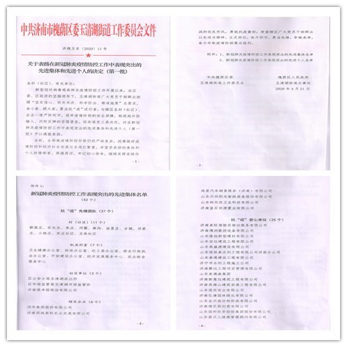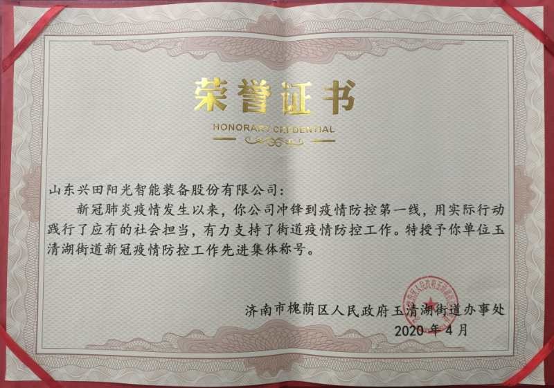 我公司——山東興田陽光智能裝備股份有限公司,因在新冠肺炎疫情防控工作中表現(xiàn)突出,被槐蔭區(qū)玉清湖街道評為“新冠肺炎疫情防控工作表現(xiàn)突出的先進集體”,并被授予“抗‘疫’先鋒團隊”榮譽稱號。