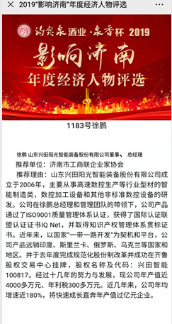 鑒于我公司在科技創(chuàng)新發(fā)展中做出的貢獻(xiàn),由濟(jì)南市工商聯(lián)企業(yè)家協(xié)會推薦,經(jīng)組委會嚴(yán)格審核,我公司總經(jīng)理徐鵬成功入圍2019“影響濟(jì)南”年度經(jīng)濟(jì)人物候選人。